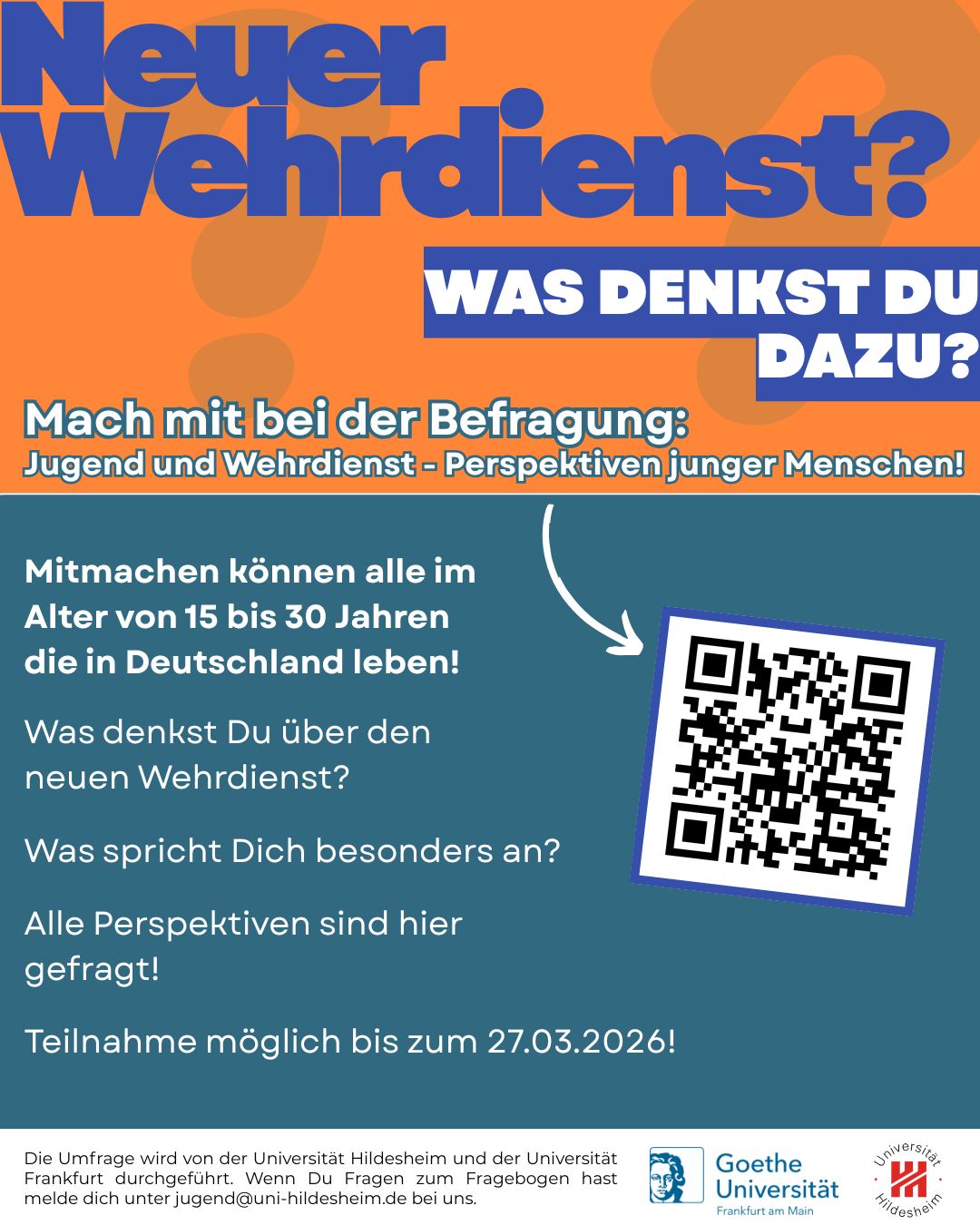 Anlässlich der seit dem 01. Januar 2026 geltenden Regelungen zum Neuen Wehrdienst, möchten Forschende der Universitäten Frankfurt und Hildesheim die Perspektiven junger Menschen zu diesem Thema erfassen und sichtbar machen. Im folgenden Artikel haben wir Stellungnahmen zum Thema gesammelt und die Umfrage verlinkt.